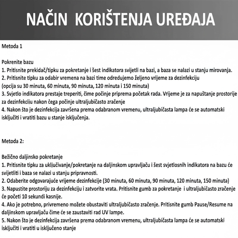 Vrlo je važno naglasiti da se UV-C lampa smije koristiti isključivo u praznoj prostoriji. Tijekom rada u prostoru ne smiju biti prisutni ljudi, djeca, kućni ljubimci ni biljke, jer je UV-C zračenje štetno za oči i kožu. Uređaj je namijenjen odgovornoj i kontroliranoj upotrebi, uz poštivanje svih sigurnosnih uputa.