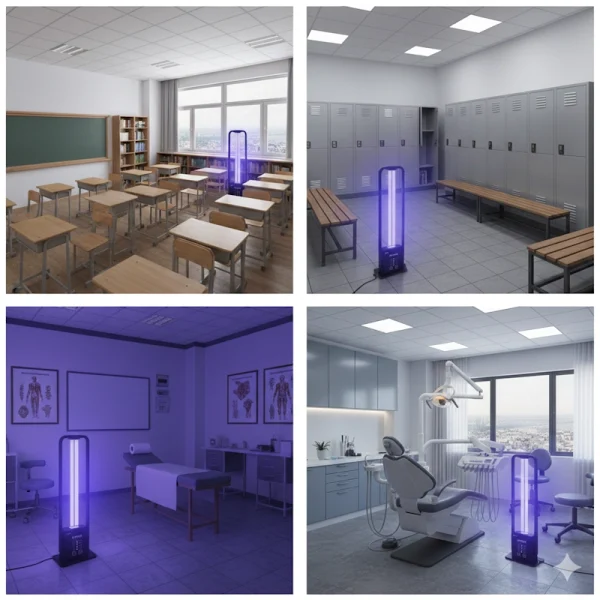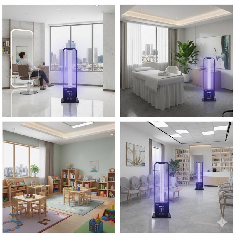 U salonima za usluge, poput frizerskih i kozmetičkih salona, lampa može pomoći u sterilizaciji zraka i radnih površina između klijenata. Zbog fleksibilnog pozicioniranja može se postaviti blizu radnog stolca, stola ili opreme koja se često koristi tijekom dana.